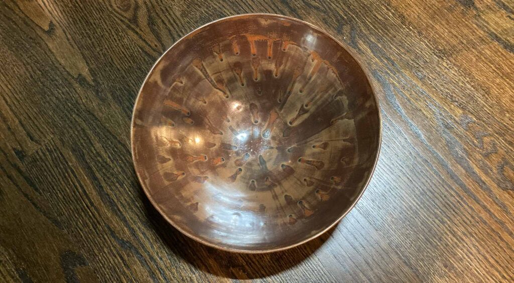 prevrandom claynextCinnamon Drips Bowl#0332 12″w x 4.5″h 10lb B-Mix Δ 10 Mayco SW 255 / 129 Δ 10 gas reduction Types of StuffClayWoolDrawFood